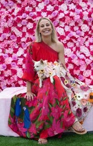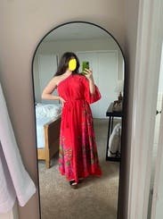 Wore this to my beloved chihuahua’s 15th bday celebration! The color of the fabric is a gorgeous blue red and the pattern is delightful. One shoulder blousy top, I wore a strapless bandeau under. Waist has a toe string belt and the skirt is flowy and hit me mid-shin. Super fun party dress but I think it would be great on vacation as well!