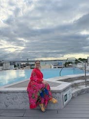 I love Farm Rio and was so excited to rent this. I love the color and the style, and the print along one side of the dress. It was so comfortable to wear out to dinner with friends. It’s also dressy enough for more special occasions too. It wrinkled a lot in transit , so a quick steam/ironing is a must .