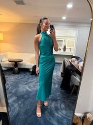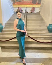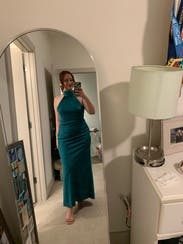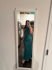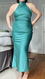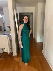 Such a sophisticated, classy piece! The color is a beautiful jewel tone and the satin fabric is very on trend. I loved the high neck and the bow feature! Satin of course can be hard for any type of perspiration and wrinkles! This also cut in rather far at the armpit so my bra was peeking a little at the sides which was definitely a negative . I wore the 4 and am 5’3 120lbs at time of event. The length was great!
