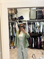 A beautiful well made jacket. The cinched in waist really gives this piece shape. It’s a classic mint color that really brought out my hazel eyes (gray, green, blue). The cut is on trend with spring fashion. There are so many fun ways you can style this jacket! I wore it with the matching shorts, gold accessories, and Mary Jane’s to church and work. It would look great with tapered stone washed jeans a lace bralette and pearl accessories or a white leather mini skirt and diamonds. I highly recommend this jacket for its fit, quality, and color.