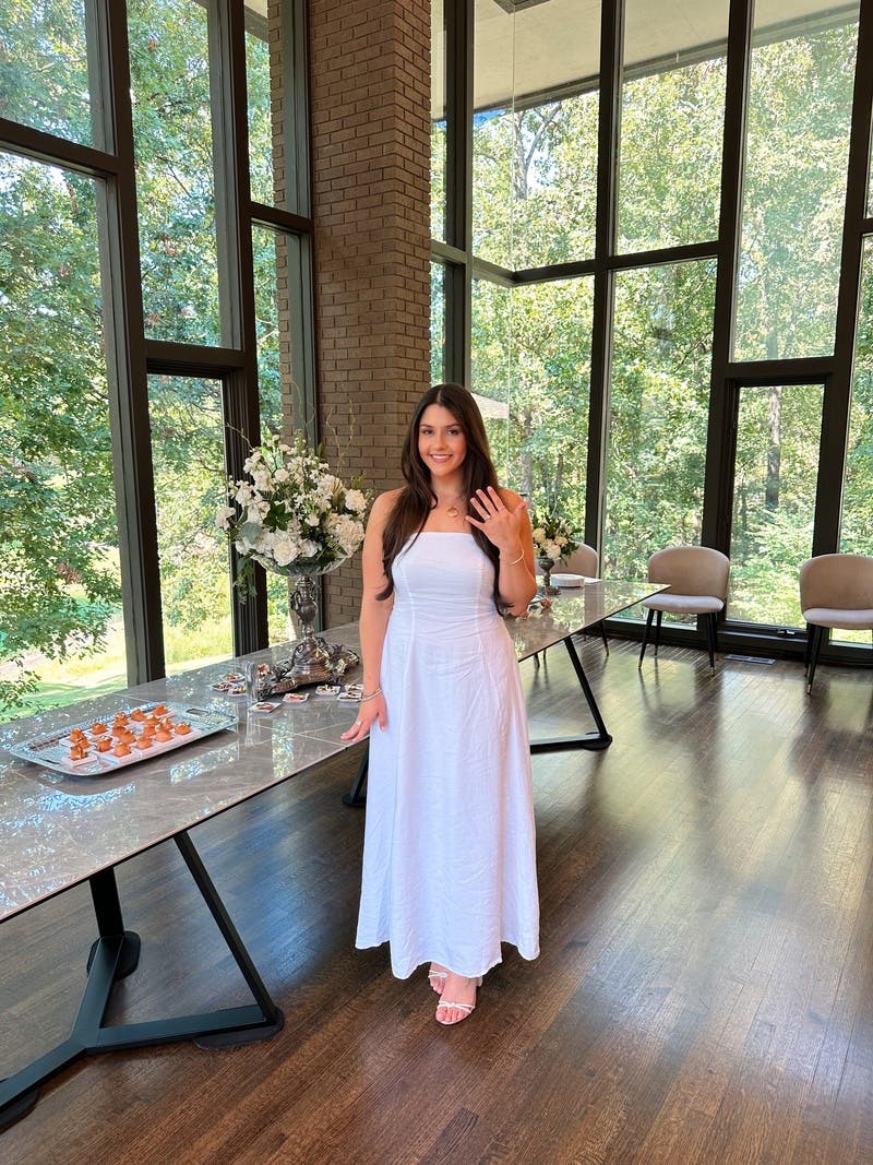 This Favorite Daughter strapless midi dress radiates effortless elegance with its sleek, structured silhouette. Perfect for a chic summer event, pair it with strappy sandals and minimalist jewelry to let the dress shine.