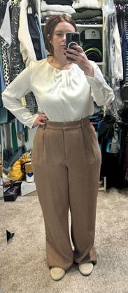 There is just SOMETHING about these pants. The waistline says feminine, the pleating says masculine, the weight and quality of the fabric whisper luxury. I don’t know that I’d ever wear them enough to justify buying them, but I will definitely think of renting them again. I rented a size 12 which is my normal size, and they fit but only just. They are high waisted and have zero stretch. If you have extra weight around the middle, you’ll want to consider sizing up. I’m 5’6” and these were loooong: I had to wear heels. However, because the pants have a more masculine feel I loved pairing them with feminine heels and a more feminine top.
