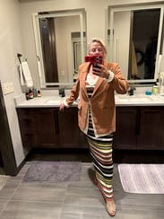 This is an awesome, fashion forward blazer. I styled it with a white vest under for dinner out, and will style a few different ways for work and weekend. Such a great piece. Slightly oversized fit but not like some of the hugely oversized blazers out there