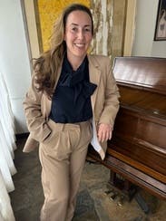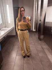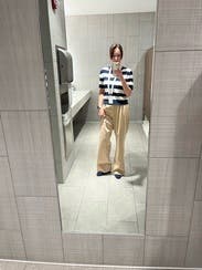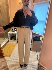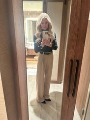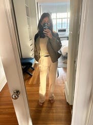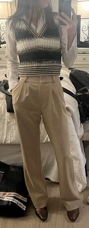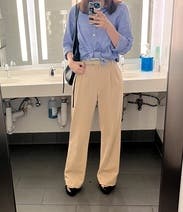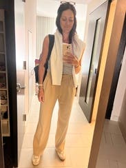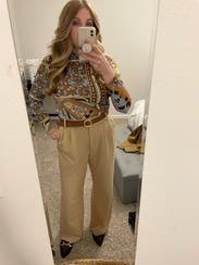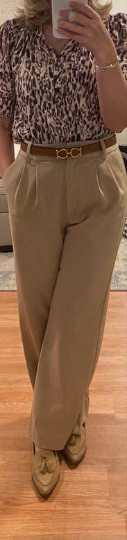 I love Favorite Daughter’s suit sets! I rented a green set in the Spring which was lovely. I used fashion tape to make these the right length and it worked like a charm. Love a tan suit! Kamala vibes.