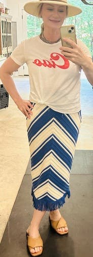 A stunning skirt, wore with flat sandals and white tank top and got so many compliments. Lunch and movie date with friends. Will purchase when it goes on sale. Heavy but not suffocating hot, it’s lined and adorable. RTR is amazing but I want every piece that fits.