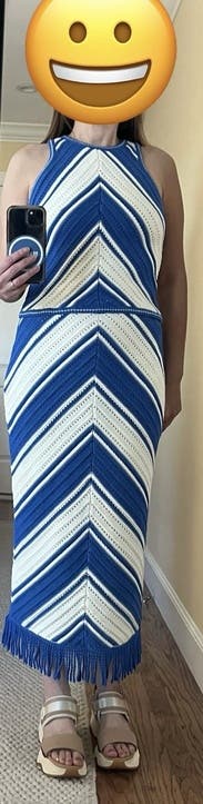 This ensemble came new, and the quality of the pieces is stellar. It’s a really beautifully crafted “thick” set that I don’t think work for my height and shape. It was too long, too bulky in the middle, and difficult to walk in because the bottom of the skirt is very restricted. It fell at my ankles and I couldn’t get in a long stride. The result? I shuffled through the day (think Charlotte’s run in SATC), and I had to pull up the skirt on both sides to make it up the stairs. As you can see, due to bra challenges I added a long sleeve shirt for the classroom. It’s not a great look. Despite these challenges, I embraced the outfit, and the colors and the trendy crochet vibe drew in the compliments. I know there are RTR goddesses out there who will rock this look!