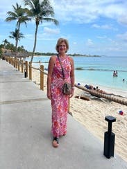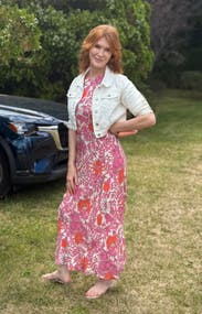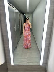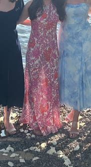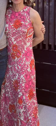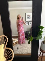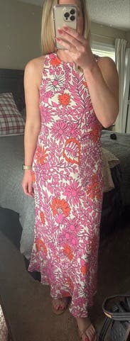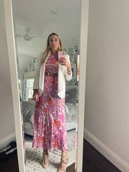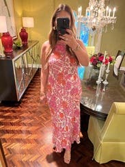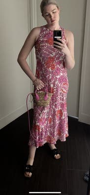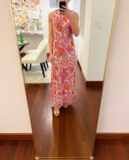 This is one of those dresses you bring on vacation and wear multiple times! Super easy to dress up for dinner or just throw on as a coverup with sandals. Fabric is breezy and lightweight, and pattern is so playful and fun. I should have rented the S instead of XS, arms were slightly tight but nothing that was uncomfortable. You could size up or down on this dress and be okay! more photo & video reviews @whimzylindzy