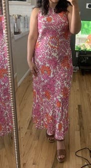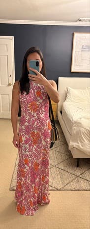 I love this dress and found it to be super flattering! Definitely would have purchased if it was in my budget. I’m 5’4” and it was the perfect length with flats. It had great movement. I wore nude undergarments but was fine without a slip.