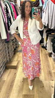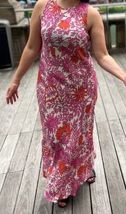 Dress is lightweight and comfortable. The colors are pink and orange. I didn’t think it was anything to write home about, but I got compliments so maybe it’s just me. I’m 5’ 4” and wore it with flip-flops if you’re looking at the photo for length.