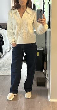 Fit tts. On the shorter and looser side. Very comfy, didn’t need a shirt underneath. The collar on this sweater gives it a bit of interest and makes it a bit more work friendly.