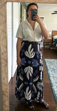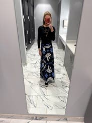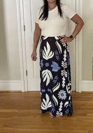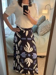 love this skirt! so comfy and flattering. very long so perfect if you’re taller or with heels on. wore out & to work