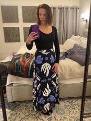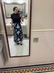 Received lots of compliments on this. Was a bit too long. Dressed it down with tennis shoes and and up with blue boots.