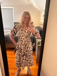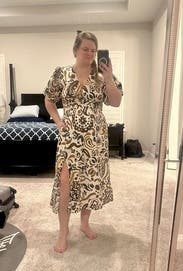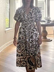 This was an easy, effortless summer rental. The dress is a thin cotton poplin. It does wrinkle easily but the pattern disguises some of this. Detailing is minimal- light smocking below the bust and on the sleeves. There is a side slit in the skirt but it stays closed and isn’t too high. Deep pockets, midi length. TTS. I’m 32/26/36 and XS fit well. Overall, it was a flattering and effortless dress but it’s lacking a wow factor, isn’t particularly well made, and requires steaming.