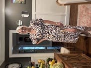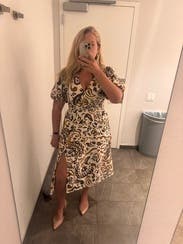 I thought this might look matronly but the high slit and cinched waist keeps it youthful! Puffy sleeves. No fuss dress if you’re tall enough. Can size down if you’re an hourglass. The slit might not be corporate work friendly. Came up mid thigh on me.