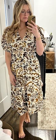 This is a cute, simple piece. The cotton fabric is thin and unlined, but still nice quality. Beautiful earth tones in the pattern made it easy to accessorize. I usually wear a L but ended up getting the M since that’s what was available. That was a gamble for me since smaller sizes never fit me, but it worked perfectly. The elastic around the ribs and sleeves was fitted without being too tight. The balance of the dress was very forgiving. There’s also a cute slit on the left side.