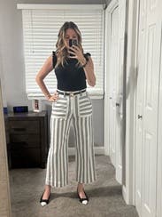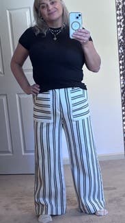Although the matching top wasn’t available when I first got the pants, it was worth the wait. The pants fit like they were tailored to me. Wide leg and a perfect length. I’m 5’4” so sometimes the pants and jeans at RTR are too long in the inseam. I wasn’t sure what size to rent because I’ve never tried this brand before. The description online said the model was wearing a 6. So I went with the 6, thinking she looks smaller but the 8 was not available. Glad I did because they’re perfect. I’m wearing a flat sandal here and they rest just above the ground. Decent pockets on the front and they have belt loops. They look great with a black body suit, but together with the matching top, I don’t think I’m returning them anytime soon. Rent them both! For reference I typically wear a 4/6 or 26/27 in pants depending the brand. See my other reviews for reference.