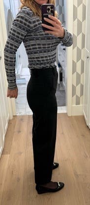 I accidentally ordered these thinking they were jeans and I have nowhere to wear trousers/dress pants to, so I wore them to church since it was freezing. I wish they were jeans because the cut is exactly what I’m looking for. A slight bow leg that isn’t even noticeable, except that it frames you well. They’re high waisted (covering my belly button) so if you have a short torso you might not love this. Easy to wear with a really cropped top because of how high the pants sit. I am 5’6 and found them to be more flattering worn with jeans. I paired them with another RTR piece, the STAUD Hampton sweater that I also own in a few other colors. These pants would be great for the corporate girlies!
