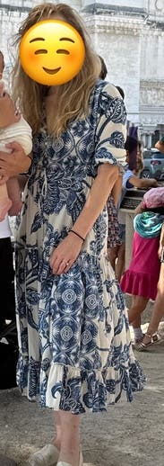 Wore this stunning blue and white dress to an event, and it was a showstopper! The fit is true to size, with a comfortable yet flattering silhouette that moves beautifully. The print is both elegant and eye-catching, giving off a sophisticated vibe. I styled it with simple wedges and a matching tote, which made the outfit effortlessly chic. Perfect for any formal gathering or special occasion!
