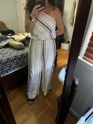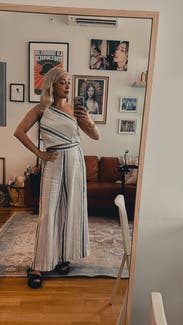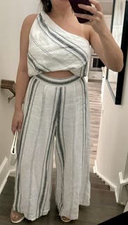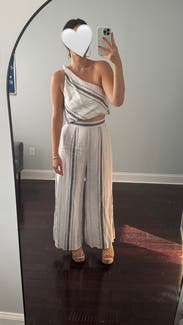 Rented this for my trip to Italy and bought it before takeoff. Just wow. Ridiculously effortless and stylish all at once. I’m a 34C and sized up to a M top. It was a toss up between the S and M pants but went with the M because of the fitted waist. I just hate things too tight on my waist. The pants are VERY voluminous BTW. So flowy. Really. If you’re on the fence, rent it. The entire ensemble is 5/5 stars. Also, the photos here show the outfit after being packed for 6 days. Pressed it, packed it, wore it. We use packing cubes.