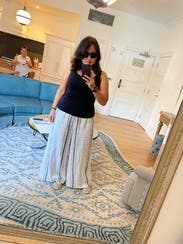 Worn with and without the matching top. Billowy and comfortable. Very much a put together look with the top. Great for warm weather outdoor events.