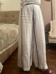 I’m a super short woman, so I was excited to see a 27” inseam on a pant… it will work for us vertically challenged ladies, but know that they are still long- this has a higher waist (which was snug) and a very low crotch, so the inseam was measured from there. Still, a great casual set (I got the matching top). Relaxed look, light and causal, fantastic for the daytime, very beachy! Really flattering.