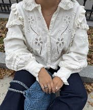 The For Love & Lemons Adelie Embroidered Top blends vintage charm with playful detail, featuring puff sleeves, floral cutouts, and ruffled trims. Style it with high-rise denim and platform Mary Janes for a playful yet polished vibe.
