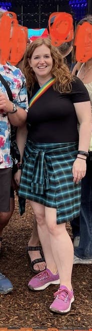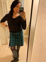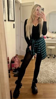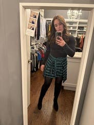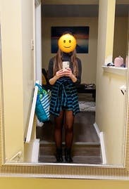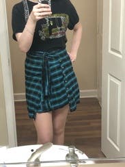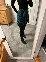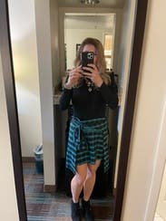 I wore this to a basketball game with my boyfriend and really liked the look! The colors are more vibrant than I was expecting--not a traditional tartan--but I think this modernizes the pattern. The wrap was a little finicky, and I found myself adjusting it more than I would have liked, but it wasn't a huge issue. I probably could have worn an XS, but the S was fine.