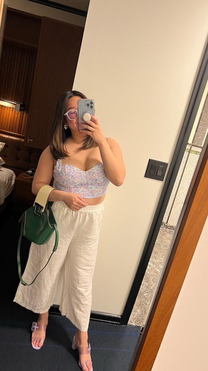 We are loving this banded-back pastel floral crop top by For Love and Lemons paired with high-waisted shorts to complete a retro look.
