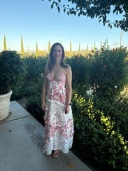 Such a pretty dress with the flowers. Perfect for a vacation. Just a little big in the chest area