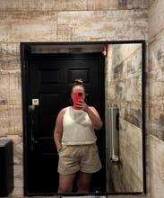 I love this shirt, especially the back! It’s lined so it’s not see-through. It’s cropped but still long enough to cover my tummy with high waisted pants. I’ll probably buy this one!