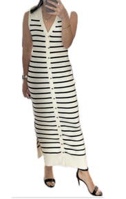 The Nadina Sleeveless Knit Dress by French Connection brings nautical vibes with its striped rib-knit and front button placket. Pair it with flat sandals or white sneakers for an easy daytime look with nautical flair.