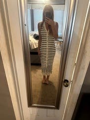 This dress was so flattering and comfortable to wear on a travel day when I wanted to look more elevated. I paired with a denim jacket and fun sneakers. I sized down based on reviews and that was the right choice for me because the dress did stretch out a bit. I loved the button detail and the fact that they were not functional. The fabric is ribbed and thick and good quality. Would definitely rent again.