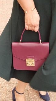 Pretty plumb color, great neutral fall bag. Nice size, fits essentials. I like crossbody bags that also have a handle. The strap is comfortable. Crossbody is perfect for daytime and the handle is ladylike for a more formal look. Strap is comfortable. Only negative is it's a bit flat if not full and has a slight mini briefcase look. Have to squeeze both knobs to open but can be done one handed.