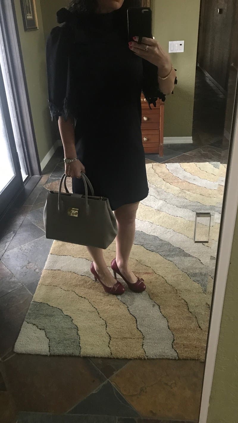 Beige textured leather tote with gold pushlock closure. Internal slip and zipper pockets. Top handles and adjustable shoulder strap. 12.6"W x 10.2"H x 6'D.