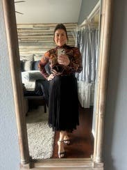 This top was perfect for a holiday party! The print is fun and I got so many compliments on it. The material is lightweight and a little sheer so I wouldn’t recommend this if you’re going to be outside.