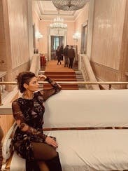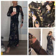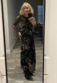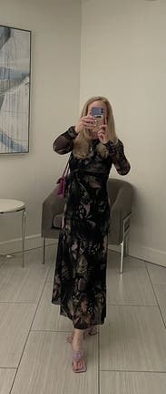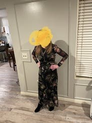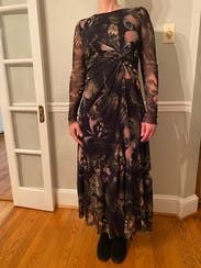 This is one of my favorite dresses I have ever tried on. Unfortunately, I only wore it around the house as my plans for the night were cancelled. But everyone who saw me in it loved it. I wish I had gotten photos with better lighting as the print doesn't show well in my photos. I plan to rent again.