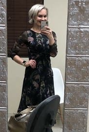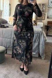 I felt like a star in this dress! It fit me great, the stretch makes it hard not to flatter a body no matter your shape. I loved the dark floral pattern, and the mesh-like fabric and semi-sheer arms were such edgy details! I styled it with black knee boots and (believe it or not) camo patterned leather earrings and got major kudos. This was a fun one. WRA.