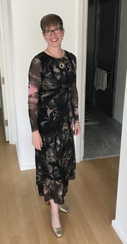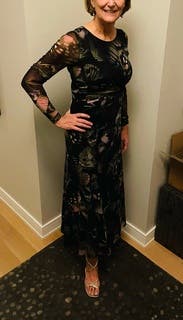 I rented this to wear for a work trip to New Orleans and the Gulf Coast but also wore it to a funeral. The sleeves of this dress are sheer which kept me from overheating in the warm Gulf coast winter heat. The gathering at the waist was extremely flattering. The coloring is somber enough that it's funeral appropriate, but the butterflies add a nice happy pop.