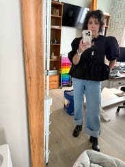 Puff sleeves added something! Wore with black crop bra underneath, elevated jeans outfit.