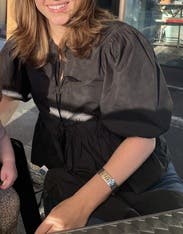 Love that this gives a slightly feminine touch to a “basic” black top. I wear at tank under it for work but have also worn more of a crop top dress it down. Sleeves are a bit balloon-y which I love.