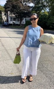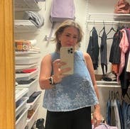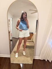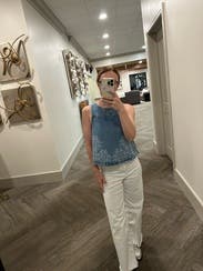 I loved this denim tank and kept it for several rentals. It came brand new with tags. The back is an adjustable buckle to make the top more fitted. The only hang up is that when you adjust it tighter, the strap will bunch if you wear a thin cardigan over it. It didn't bother me and I even considered purchasing but didn't because of the price.