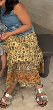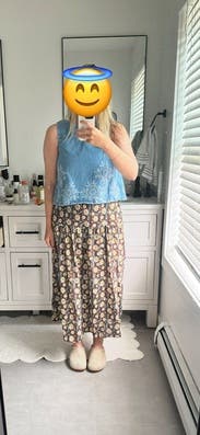 I was excited about this one but found the stiff large boat shaped bottom not very flattering and made me self conscious about an inadvertent peekaboo when going up stairs and even bending down. I was excited about the unique back strap but it didn’t end up being too practical since bra strap showed often. I did enjoy the print and casual material though.