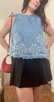I loved this piece so much. The denim is heavy but falls away from the body, making it a nice breezy choice on a hot day. The back had a nice little pop of sexy. Wore it several times.