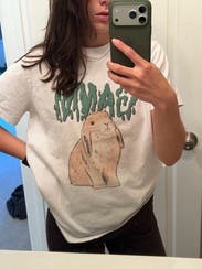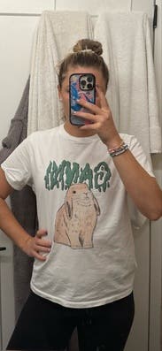 Loved this tee! I got a large for an oversized fit I could tuck in. The cute bunny paired with the bold Ganni graphic makes it feel playful but cool - perfect for elevating a very simple outfit. Throw on a chunky necklace and you're set!