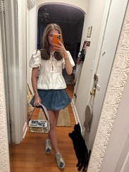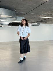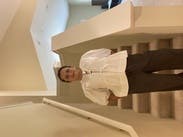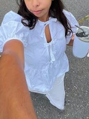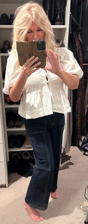 This blouse is beautifully structured with puff sleeves and a cinched waist that flatters the figure. The tie front adds a nice detail and helps adjust the fit. The fabric is crisp and holds its shape well, giving the whole look a polished feel. I wore it with jeans, a mini skirt, and a long skirt — and it worked with all of them. It's one of those rare pieces that can go from casual daywear to something more elevated with just a quick styling change.