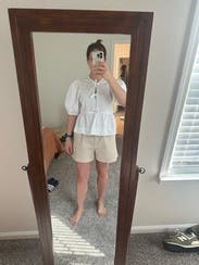 Wore this on vacation with denim shorts and a silk skirt. Didn’t love how tight the elastic was on the sleeves but the overall look was cute.