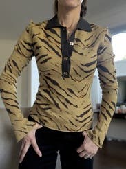 This sweater is lightweight but very well made, so the material felt substantial. The animal print and polo style are very on trend. Fit was perfect. Fun gold details. Excellent for work or play.