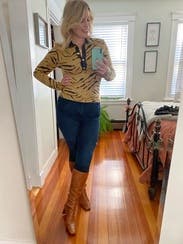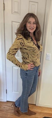 This is a great sweater to wear for leveling up a little bit. Beautiful colors. I'm obsessed with animal prints or anything that is reminiscent of an animal print. The buttons on this are gorgeous. However, it's too tight to wear this completely buttoned up. And I am small chested. I think it's just made to be worn open - completely. The issue with that is that it has a very deep V-neck when worn open. I wore a Cami under it that just peaked out. And I found this to be acceptable. The sleeves are very long so it brings the color down onto your hands. The sleeve seam is open on your hand up to your wrist. It's an interesting look. Generally, I am between a medium and a large and this was a large and still very snug. That's the only reason I gave it a four really. I'm 5'10" so it's a pretty crop look. Nice level up sweater. A little glam.