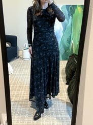 Part of the problem is that Ganni runs really big and tall- maybe if I were 7” taller this would have been ok. But the print is really somber and the neckline is so conservative without being cool- tried lots of styling but just hated it and didn’t wear.