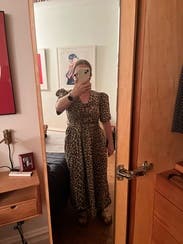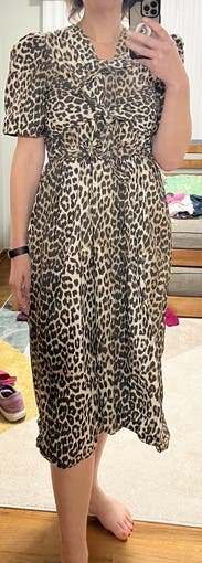 Better in person. Perfect puff sleeves. Fun animal print. Great length for my petite frame (a few inches above my ankle). Perfect dress for a warm fall day (or summer or spring). Definitely can see the boobs, so couldn’t wear to office, but was able to pull off for virtual meetings. Can dress up or down.